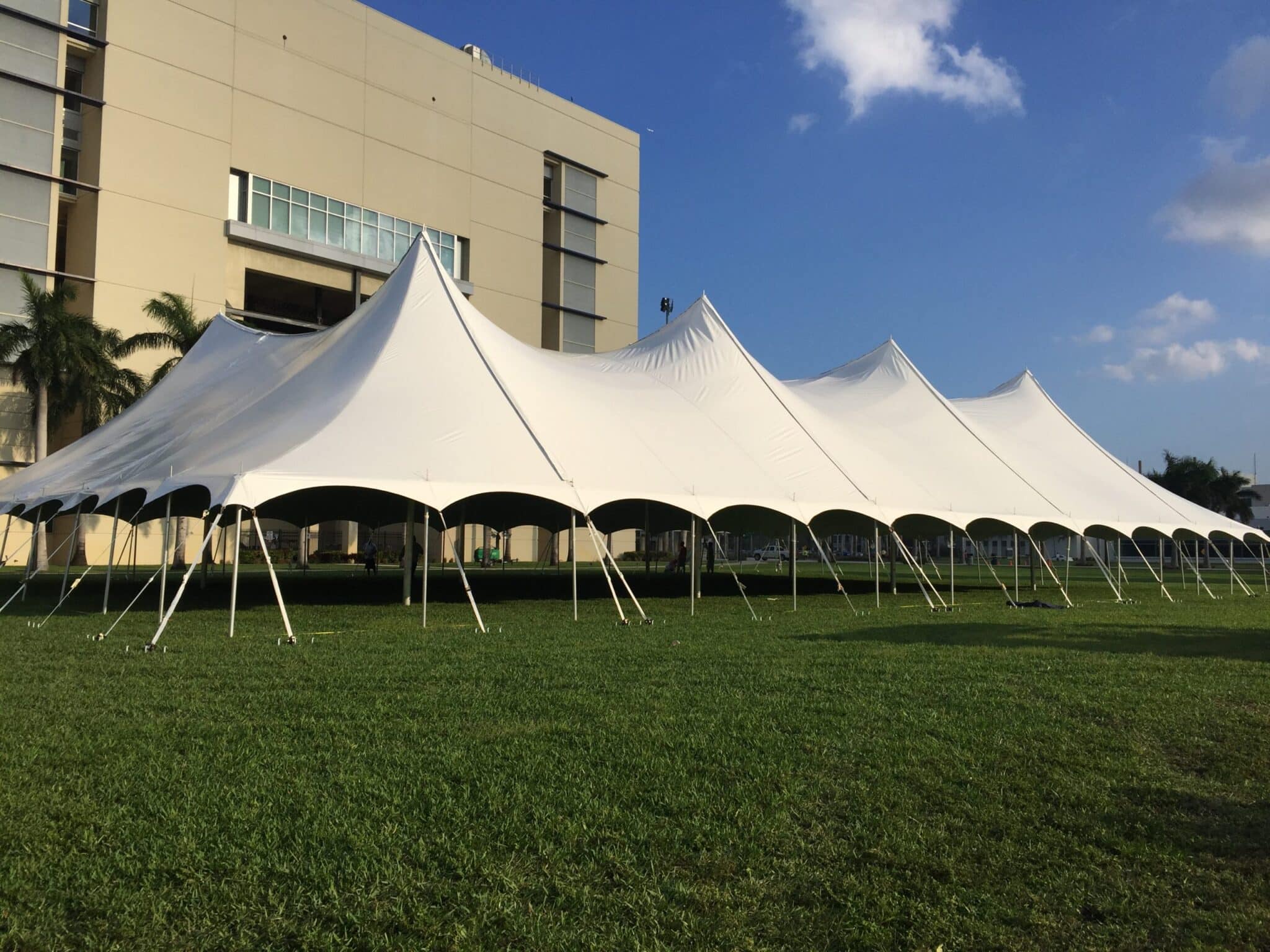 Excellent for weddings, festivals, company picnics. Anywhere that staking is possible and surface is relatively level. Traditional classic design, cost efficient and expandable.